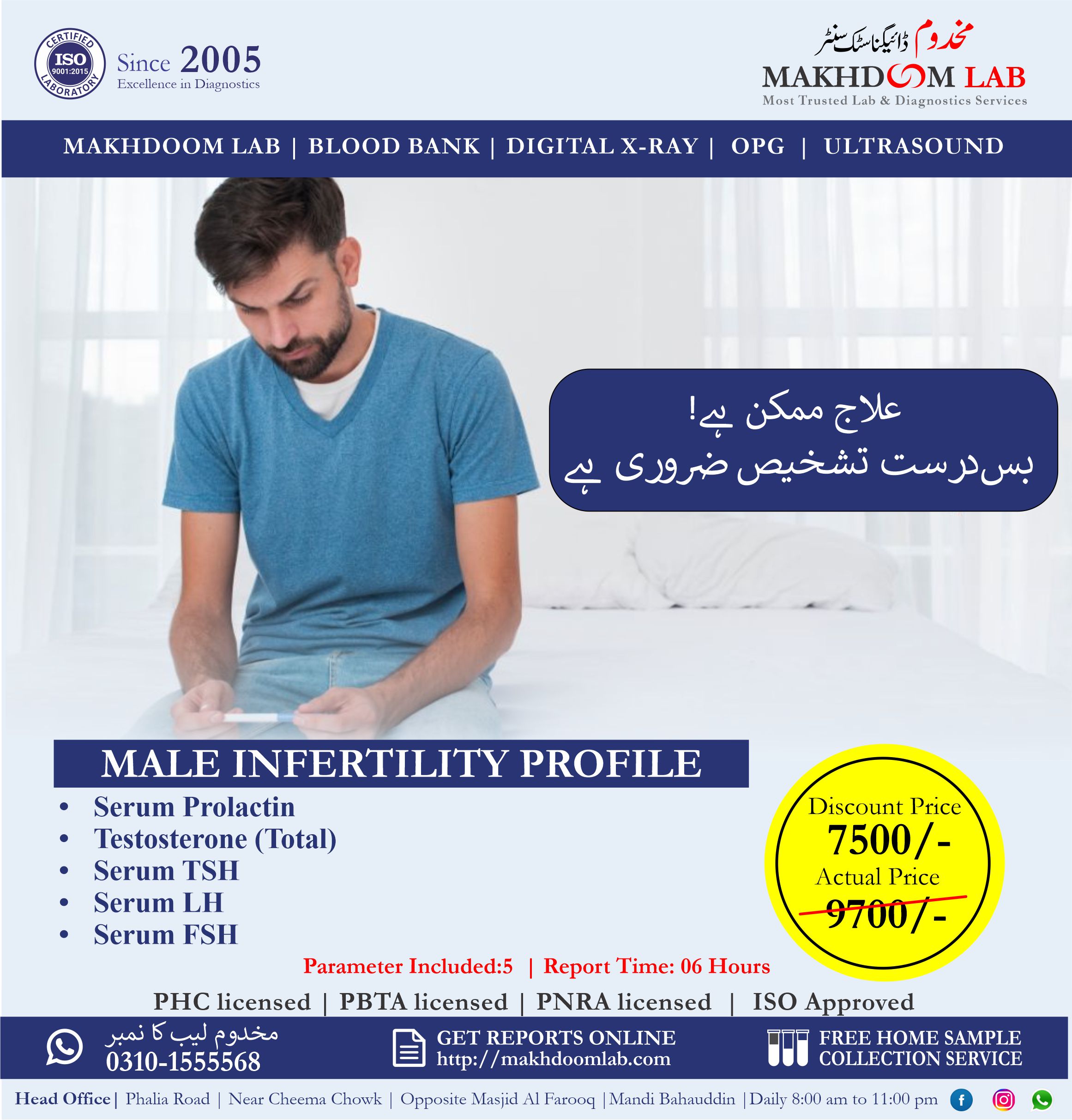Take control of your health journey with our MALE INFERTILITY PROFILE Male infertility can be a challenging obstacle for couples aspiring to conceive. At Makhdoom Diagnostic Centre, a leading-edge facility boasting robotic automation, comprehensive testing for male infertility is available. Utilizing advanced techniques such as semen analysis, hormone profiling, potential causes of infertility can be efficiently identified. Seeking testing at Makhdoom Diagnostic Centre offers distinct advantages, including precise diagnostics aided by cutting-edge technology. Early detection of male infertility issues enables prompt interventions, enhancing the chances of successful conception. With state-of-the-art resources and expert care, couples can navigate their fertility journey confidently, knowing they have access to superior diagnostic services.