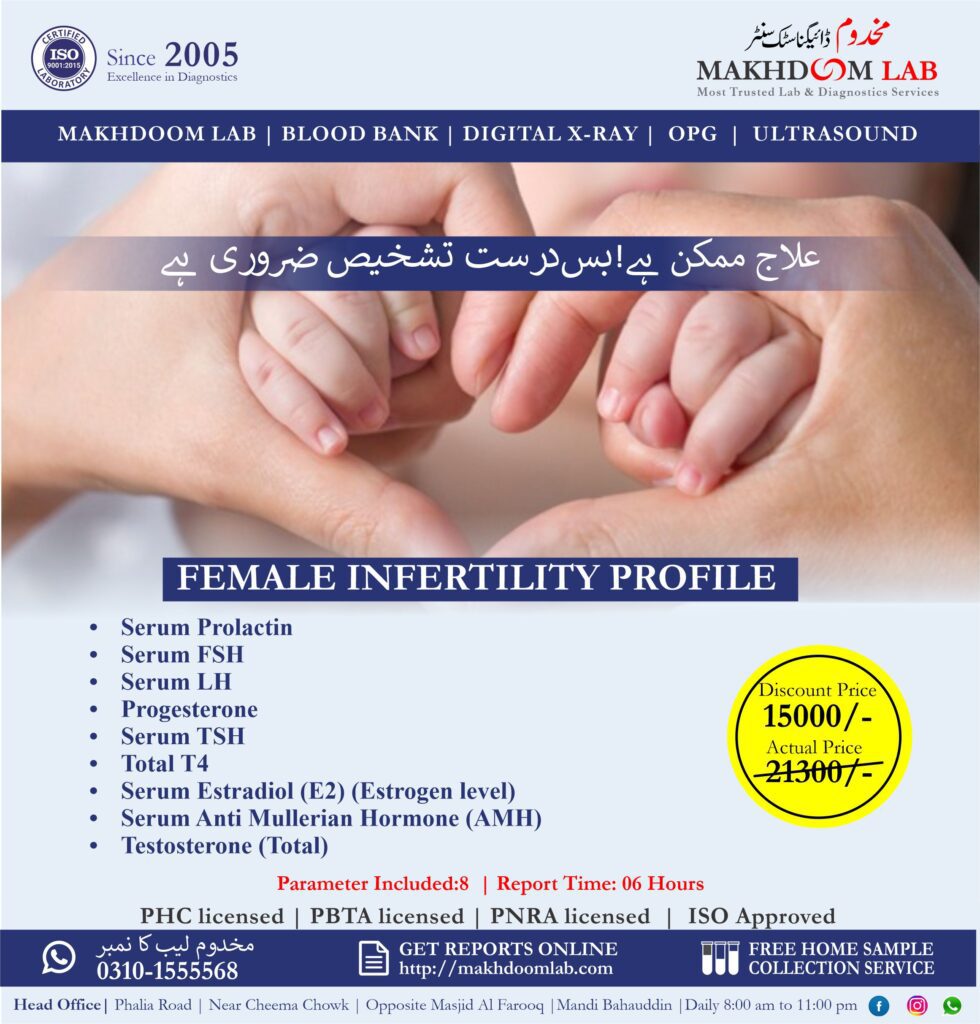 Female infertility is a complex issue affecting many couples. At Makhdoom Diagnostic Centre, a state-of-the-art facility equipped with robotic automation, comprehensive testing for female infertility is available. Through advanced assessments including hormone evaluations, ovarian reserve testing, and ultrasound examinations, potential causes of infertility can be identified. Seeking testing at Makhdoom Diagnostic Centre offers several benefits, including precise and efficient diagnostics facilitated by cutting-edge technology. Early detection of female infertility issues allows for timely interventions, increasing the likelihood of successful conception. With expert care and innovative resources, couples can navigate their fertility journey with confidence, knowing they have access to top-tier diagnostic services.